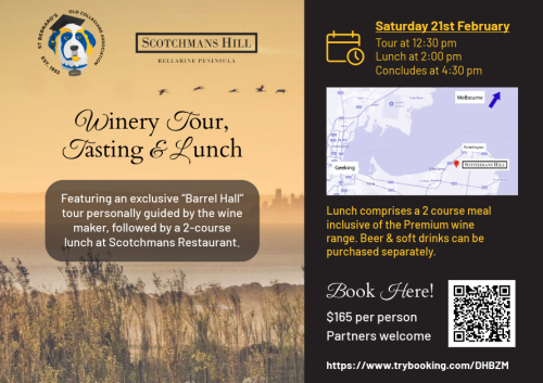 | Scotchmans Hill Winery Tour | Sat 21 Feb | 12:30pm | Scotchmans Hill Winery, Drysdale | Open - Book Here! |
