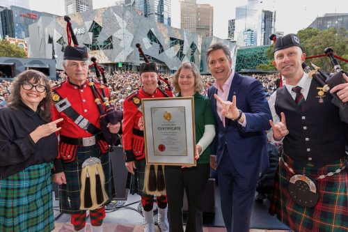 Back in 1976, he was one of the original Pipers riding on the back of the now-iconic truck as it rolled down Swanston Street for AC/DC’s legendary film clip (check out his close-up in the photo above!). Nearly fifty years later, Kevin found himself centre stage once again, surrounded by a record-breaking assembly of pipers delivering the same electrifying tune in Federation Square.