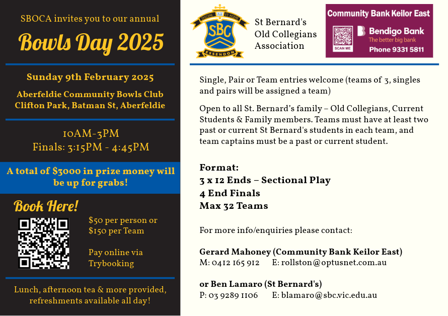 We invite all from the St Bernard's family - Old Collegians, current students and family members - to participate. Bookings are $50 per person and can be made at this link: https://www.trybooking.com/CXMJM or through the QR code above.
