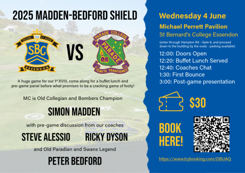 Come down to the Michael Perrett Pavilion at 12PM for a special buffet lunch and pre-game panel with the Shield's namesakes, Bombers champion Simon Madden and South Melbourne legend Peter Bedford. you'll also hear from the coaches of each side - Steve Alessio from St Bernard's and Ricky Dyson from Parade. The match then begins at 2PM - be there for what promises to be a cracking game of footy!