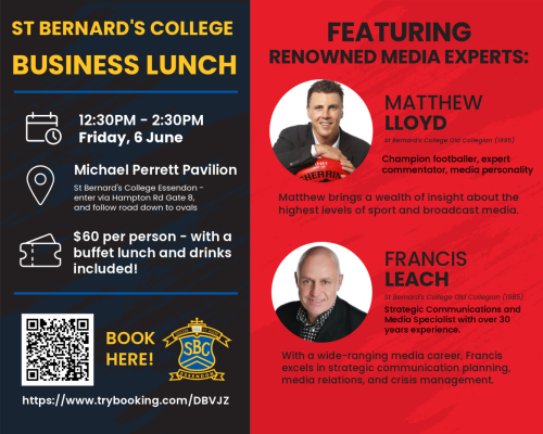 The event will take place on Friday 6 June, at 12:30PM down at the Michael Perrett Pavilion. The lunch will feature old collegians Matthew Lloyd and Francis Leach, who both have a wealth of experience in broadcast media to share. Matthew brings his expert knowledge of the AFL from both on and off the field, while as a strategic communications expert, Francis has over 30 years of valuable experience to draw on.