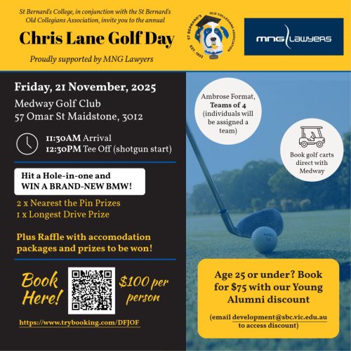 This event is not to be missed for any golf enthusiast. Tickets are $100 per person (inclusive of food and green fees) and can be booked here: https://www.trybooking.com/DFJOF If you're under 25, contact development@sbc.vic.edu.au for tickets at a special young alumni price.