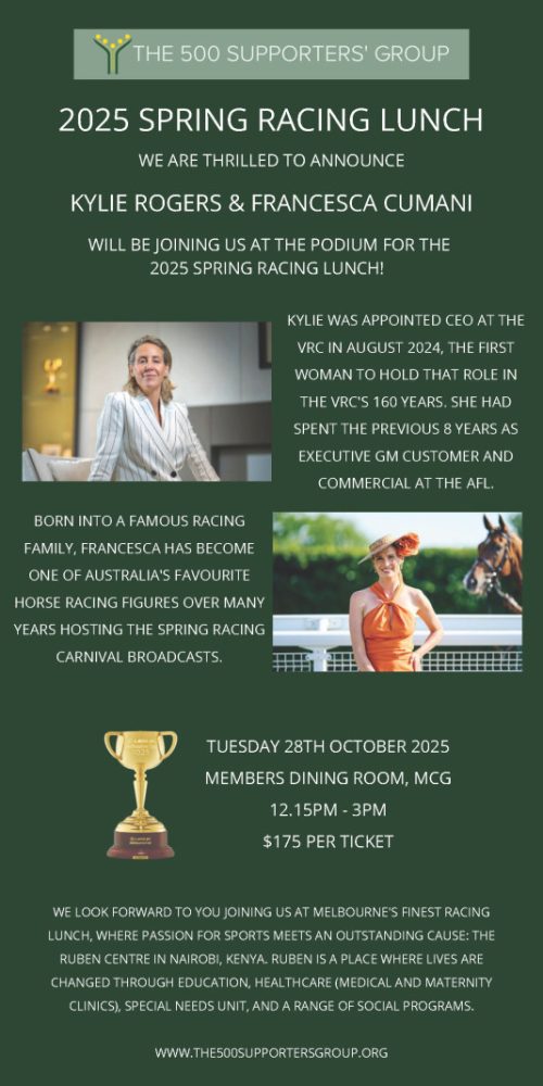 The 500 Supporters' Group has announced their Spring Racing Lunch for 2025! It's sure to be another great event, with all funds raised going to the Ruben Centre in Nairobi, Kenya. Book your spot here: https://www.500supportersgroup.org/events-lunch-racing