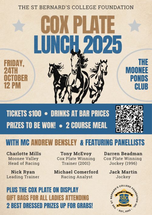 The sun is starting to come out, the spring carnival is upon us, and the St Bernard's College Foundation are once again pleased to invite you to our annual Cox Plate Lunch, held on Friday 24 October at the Moonee Ponds Club.