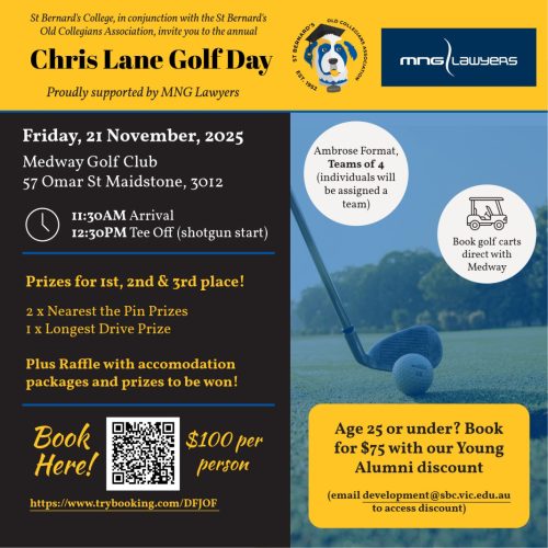 This event is not to be missed for any golf enthusiast. Tickets are $100 per person (inclusive of food and green fees) and can be booked here: https://www.trybooking.com/DFJOF If you're under 25, contact development@sbc.vic.edu.au for tickets at a special young alumni price of $75.