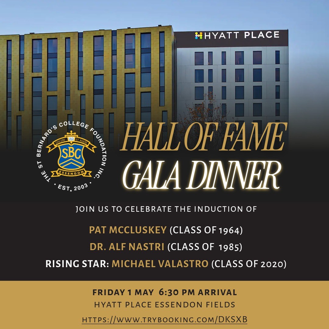 You are cordially invited to the St Bernard's College Foundation Hall of Fame Gala Dinner, an evening of fine dining, celebration, and reminiscing in the Atrium at Hyatt Place Essendon Fields.