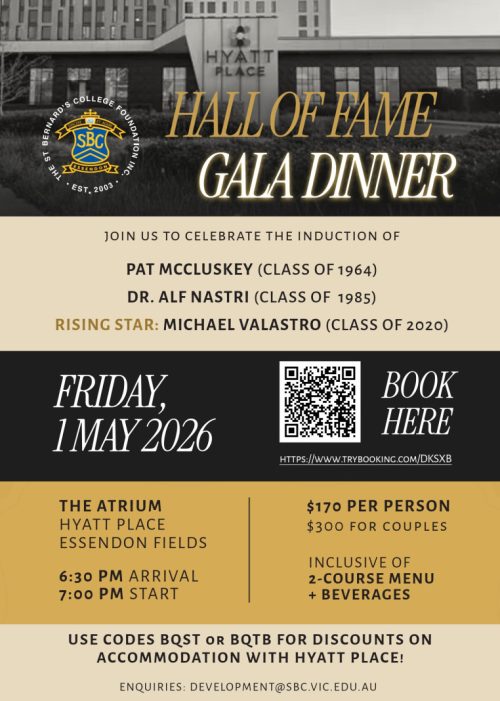 All in our College community are cordially invited to the St Bernard's College Foundation Hall of Fame Gala Dinner, an evening of fine dining, celebration, and reminiscing in the Atrium at Hyatt Place Essendon Fields. ![]()